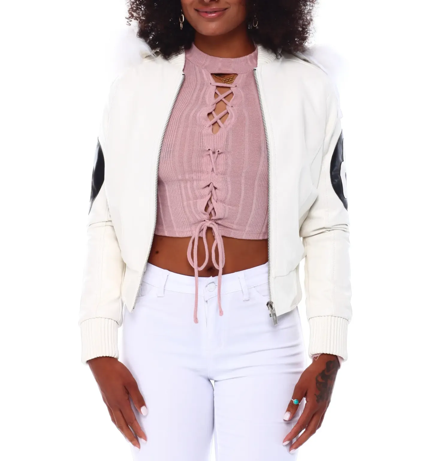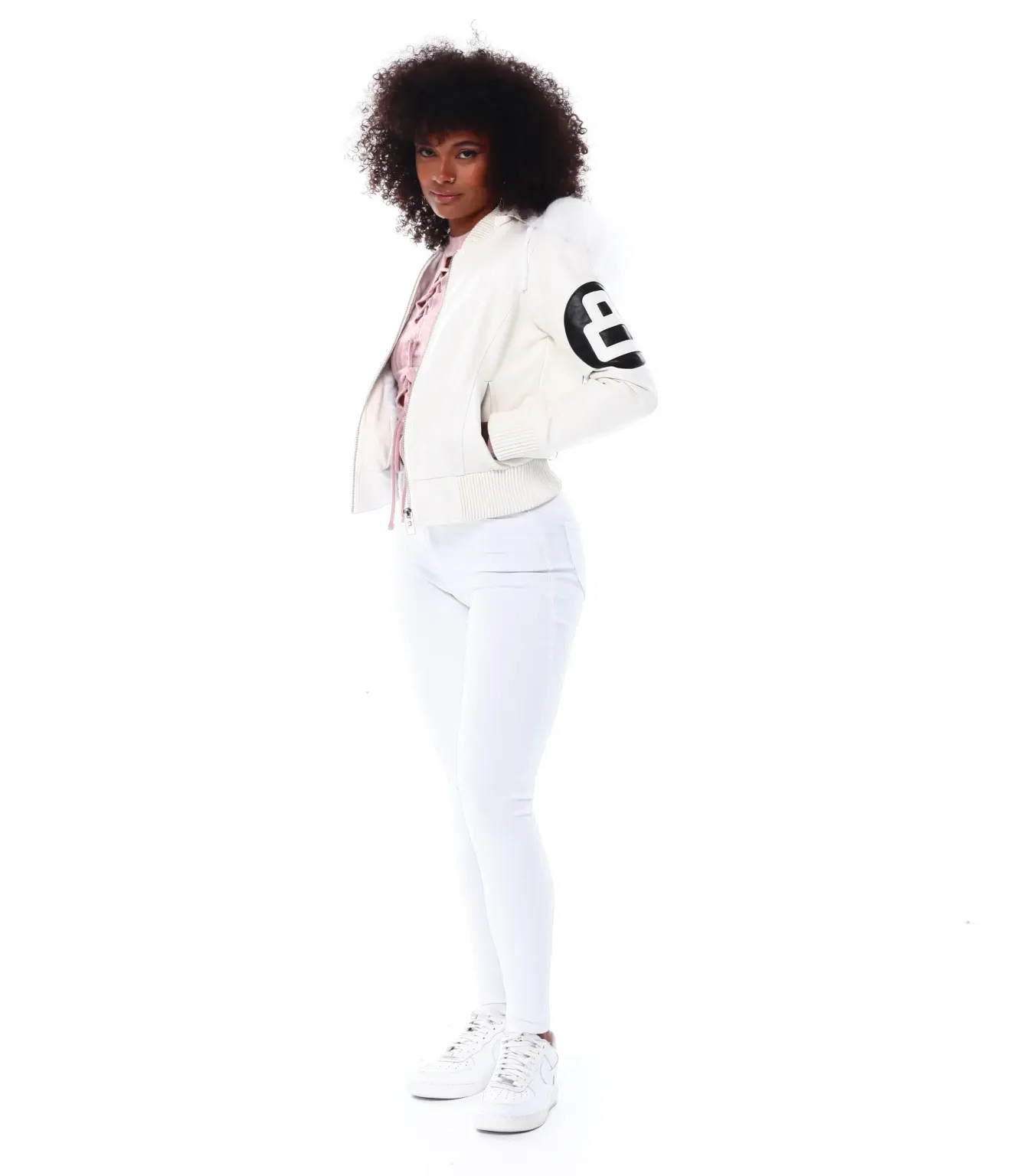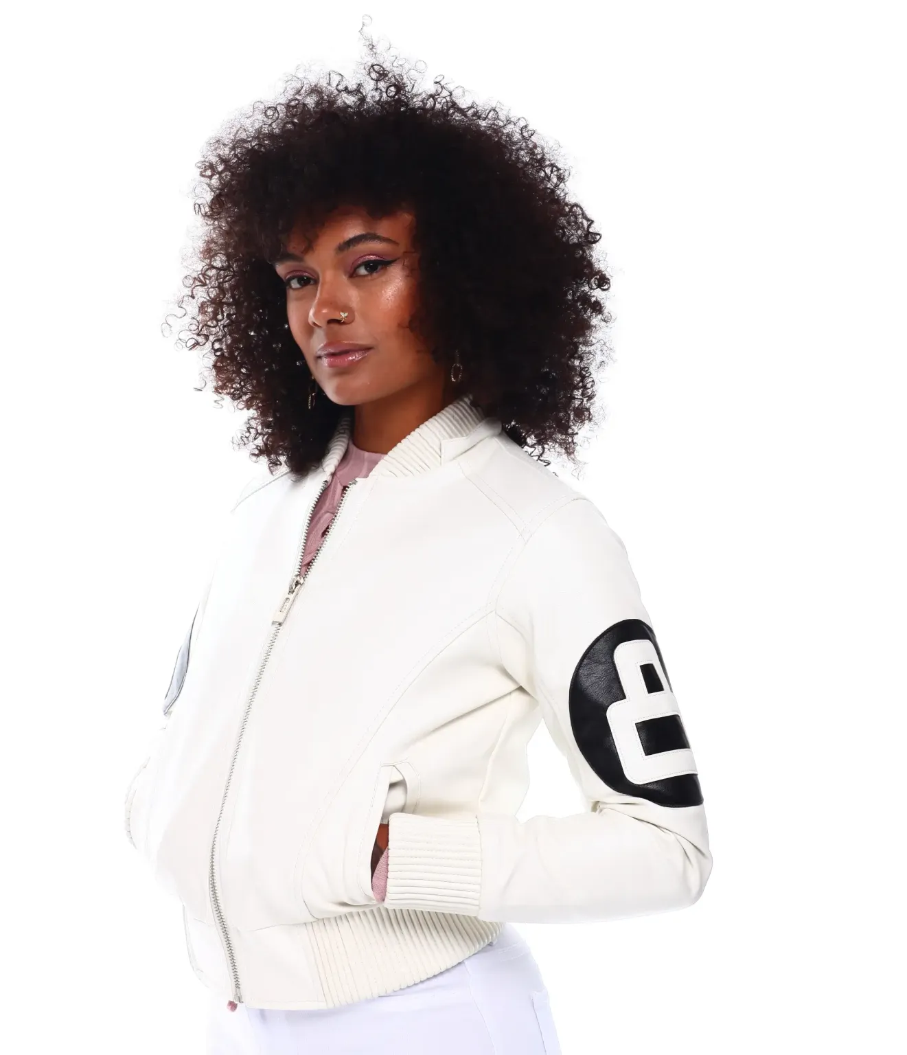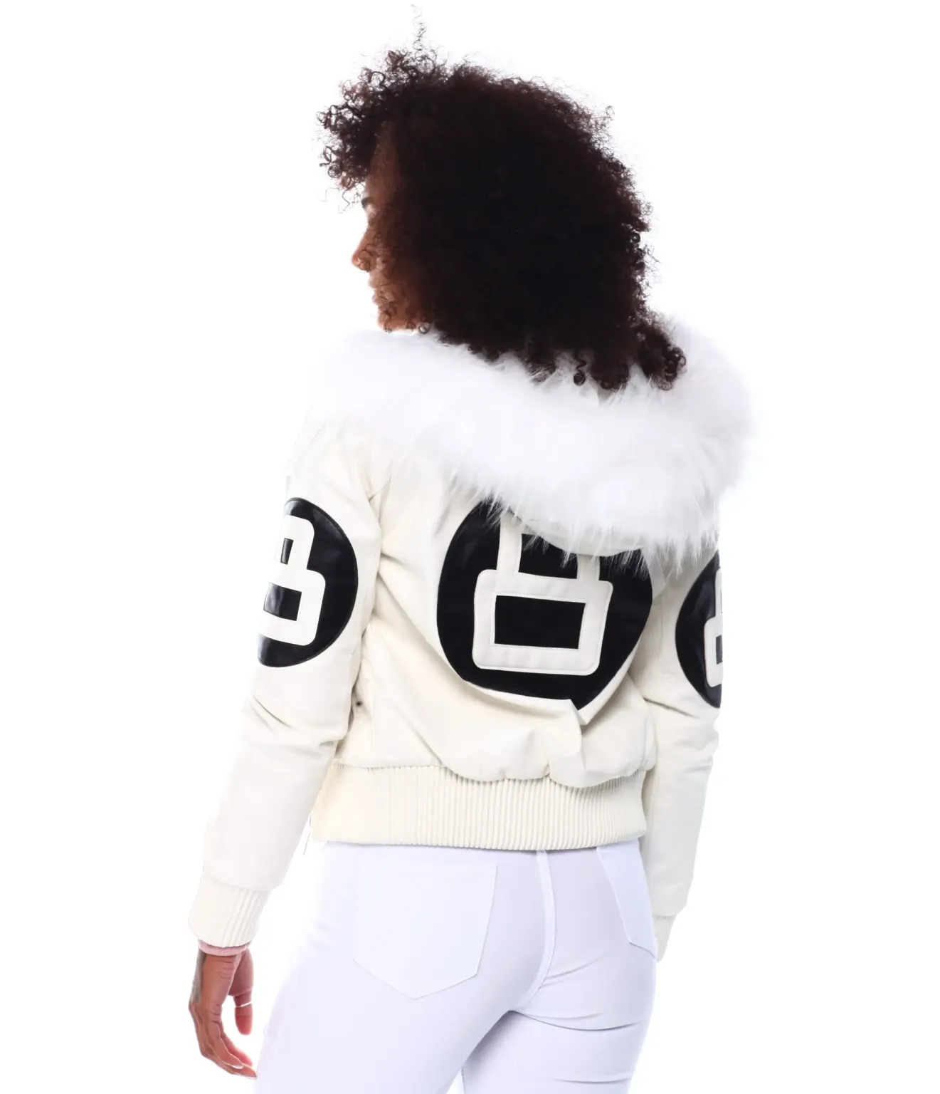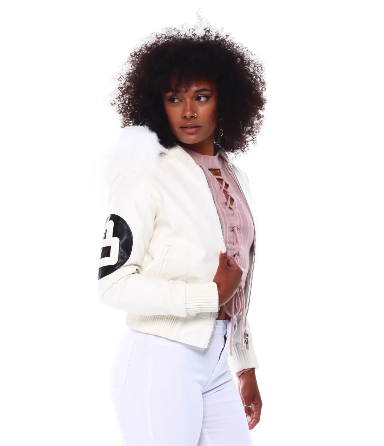 Women’s 8 Ball White Hooded Bomber Jacket Leather